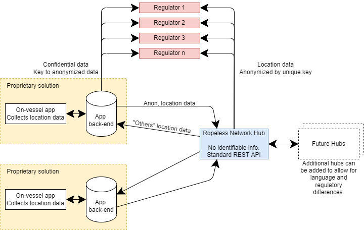 The Ropeless Network is a shared cloud service that allows Manufacturers and Gear Marking solution providers to share location data in a safe and efficient manner. Access is strictly controlled and those sharing data can anonymize it to protect sensitive information.